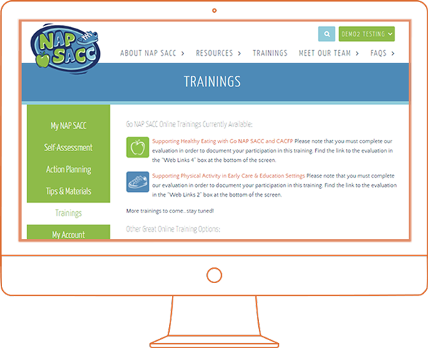 Go NAPSACC online trainings dig deeper into the best practices and provides ways to implement new tools. Trainings show providers how their practices improve children’s health, and offer clear and practical advice for improving practices in their own programs.