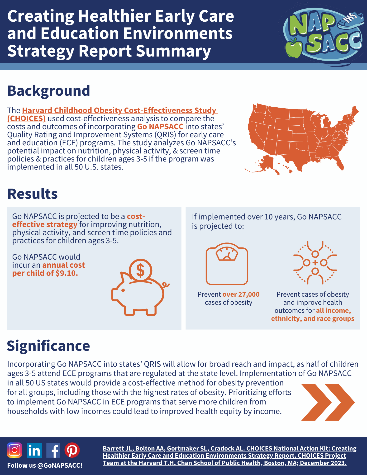 The Harvard Childhood Obesity Cost-Effectiveness Study (CHOICES) published Strategy Report: Creating Healthier Early Care and Education Environments, a paper using cost-effectiveness analysis to compare the costs and outcomes of incorporating Go NAPSACC into states’ Quality Rating and Improvement Systems (QRIS) for early care and education (ECE) programs. The study analyzes Go NAPSACC’s potential impact on nutrition, physical activity, & screen time policies & practices for children ages 3-5 if the program was implemented in all 50 U.S. states.