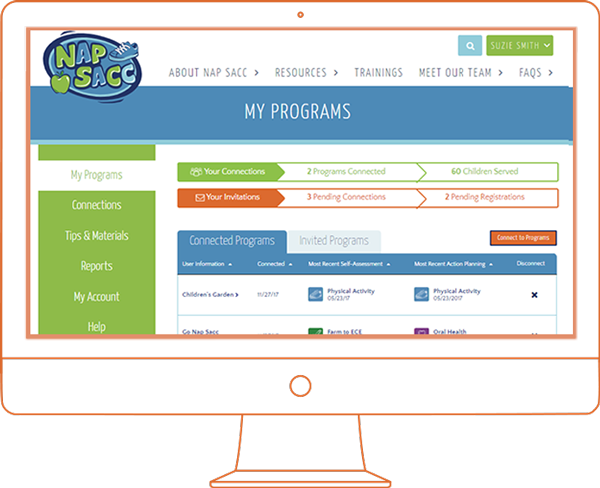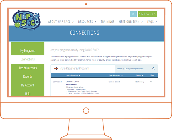 TA consultants can locate and connect with their local child care programs using Go NAPSACC’s user-friendly Connections dashboard. Through this dashboard, TA consultants can find local child care providers, invite them to connect, and then track providers’ progress as they work together.